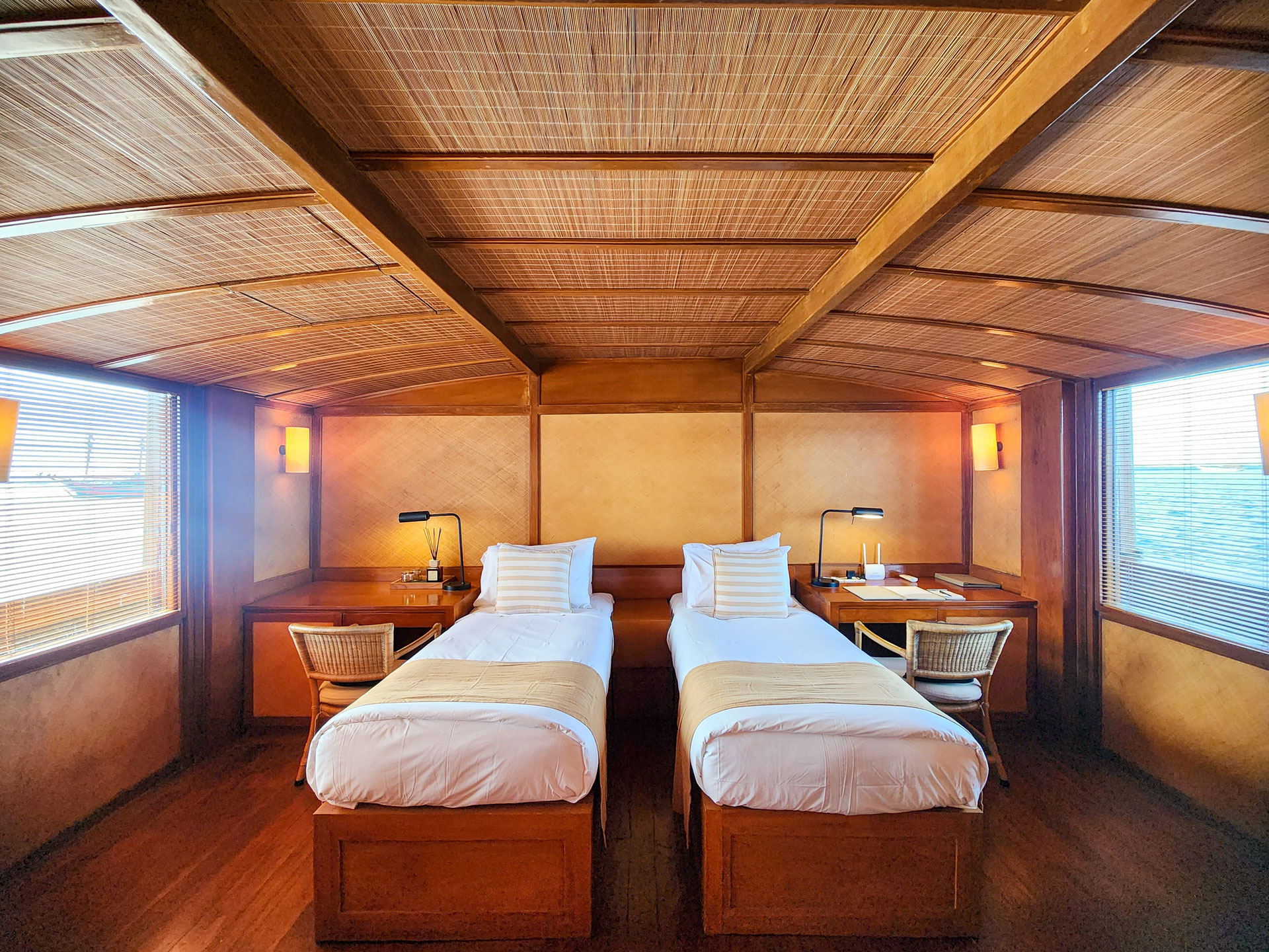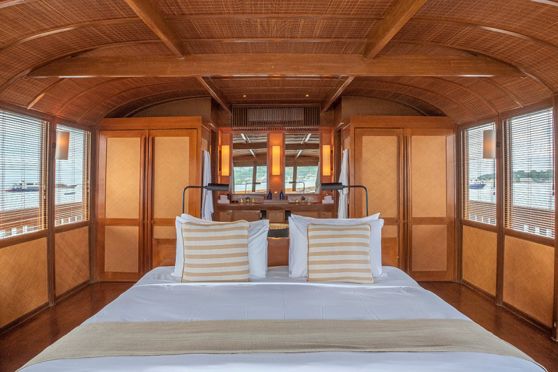 Situated on the upper deck, this expansive cabin enjoys unbeatable panoramic views, a king size bed, two sofas at the foot of the room and two day beds outside on a private terrace at the stern.